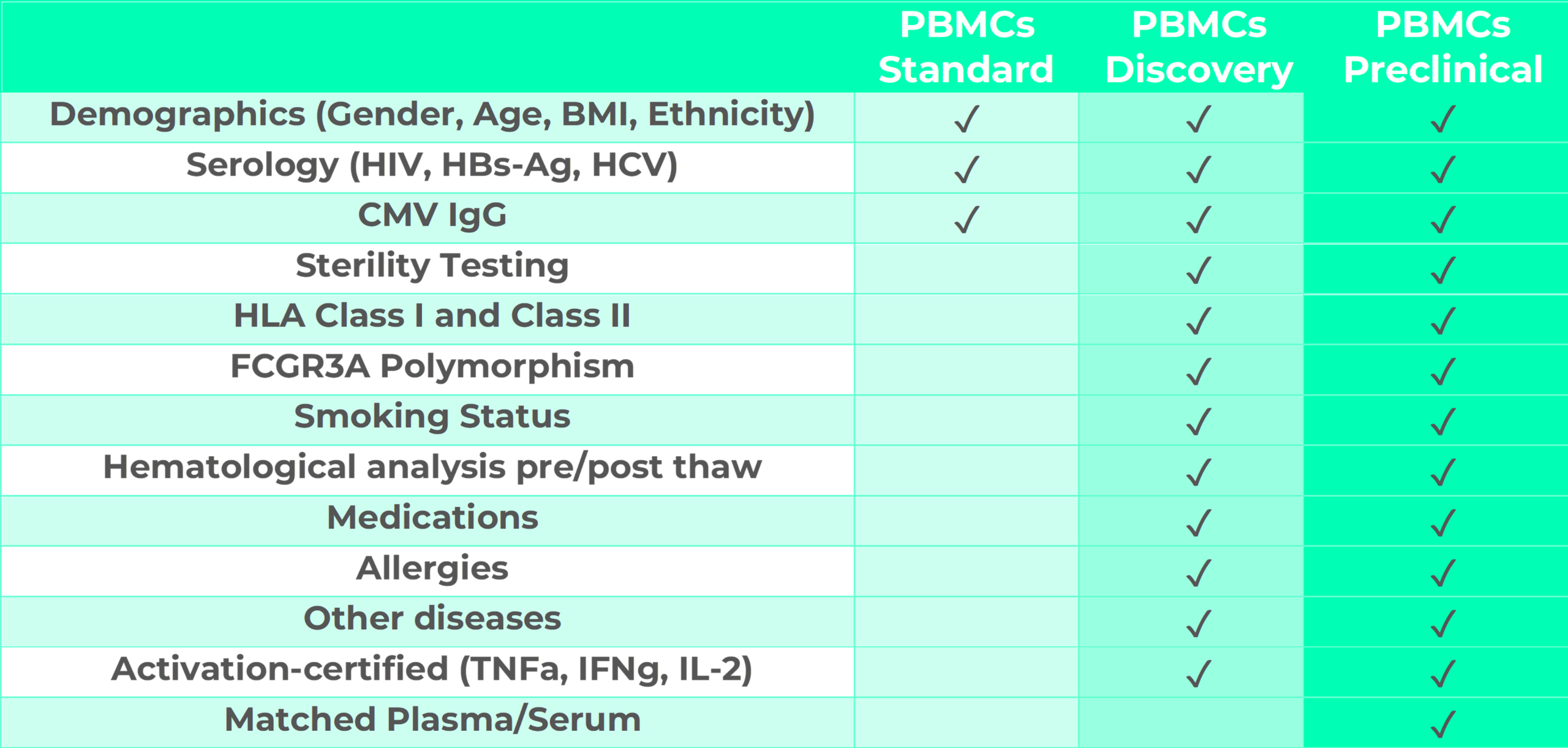 Every PBMCs lot is tested for sterility and cell activation upon stimulation. Moreover, PBMCs come with donor information including demographics, serology, HLA class I and II characterization, FCGR3A Polymorphisms, smoking status, hematological analysis pre- and post-thaw, medications, allergies and eventual other diseases. Data are made available according to the chosen plan.